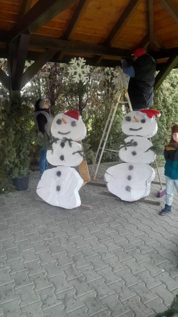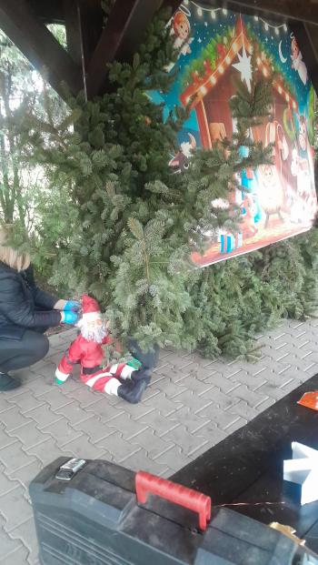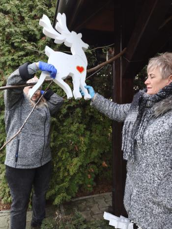 Drugim wydarzeniem było świąteczne dekorowanie przestrzeni przy Domu Ludowym – 14 grudnia. W tym roku pod wiatą powstała przytulna strefa świąteczna z symboliczną szopką,choinkami , bałwankami a nawet… reniferami.