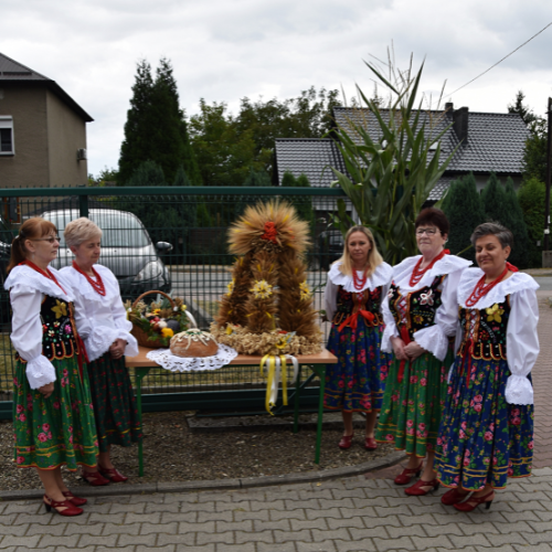 Nie zabrakło także części artystycznej – na scenie wystąpiły panie z KGW Harmęże, które zaprezentowały piękne pieśni o sołectwie i gminie. W wyjątkowej atmosferze przewodnicząca KGW wraz z sołtysem przekazali wójtowi symboliczny bochen chleba, którym następnie częstowano mieszkańców. Całość dopełniały tradycyjne dekoracje dożynkowe – wieńce, snopy zbóż, kwiaty i owoce, które stworzyły niepowtarzalny klimat.